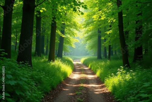 Fototapeta premium Sun-dappled path winding through a lush green forest, leaves overhead creating a canopy , outdoor, light, forest