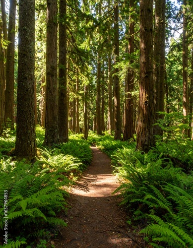 Fototapeta premium Sun-dappled path winds through lush forest, ferns lining a dirt trail