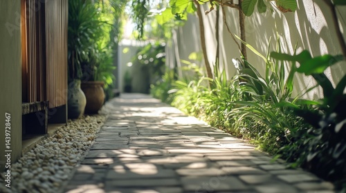 © sumbayana, Obraz premium Sun-dappled Stone Path Through Lush Greenery