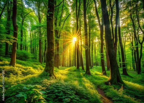 © Autun, Fototapeta premium Sun-dappled sunlight filters through a lush, magical forest canopy, creating a serene, low-light scene.