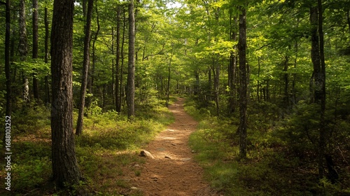 © bejo_1994, Obraz premium Sun-Dappled Trail through a Verdant Forest in Adirondack Mountains