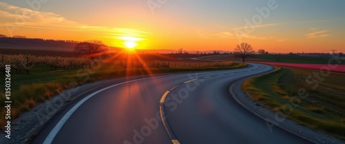 Naklejka premium Sun-drenched asphalt road curves through idyllic spring countryside at sunset, photography, sun, sunset