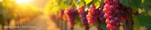 © Sunisa, Fototapeta premium Sun-Drenched Autumn Grapes Hanging Heavy on the Vine, Ready for Harvest in a Lush Vineyard