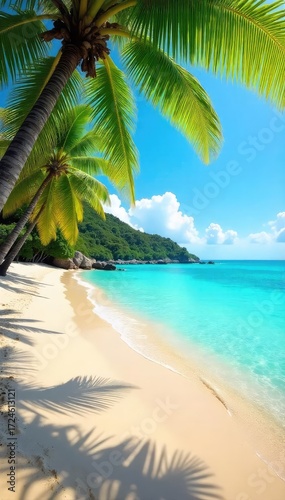 © Jameo, Obraz premium Sun-Drenched Beach Paradise Turquoise Waters, Golden Sands, and Swaying Palm Trees ? Perfect for Summer Travel and Vacation Marketing