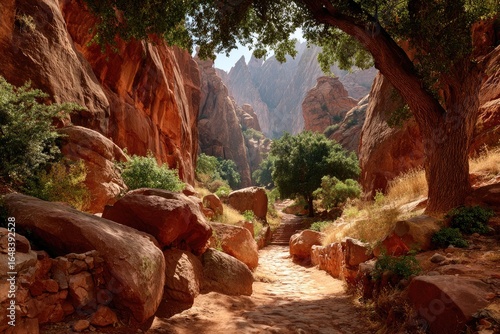 © Sifa, Fototapeta premium Sun-drenched canyon path, red rock walls (1)