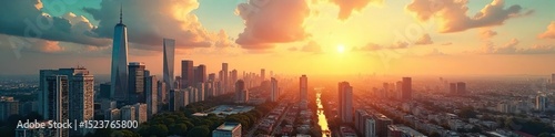 Fototapeta premium Sun-drenched cityscape, towering buildings reaching for a vibrant summer sky...