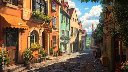 © isend, Fototapeta premium Sun-Drenched Cobblestone Street in a Charming European Village