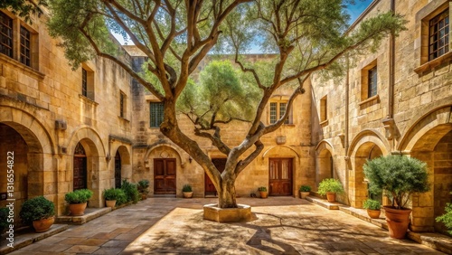 Fototapeta premium Sun-Drenched Courtyard with Ancient Tree and Stone Architecture A Serene Mediterranean Scene