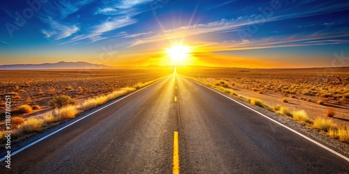 Naklejka premium Sun-Drenched Desert Highway: Endless Straight Road, Majestic Landscape...