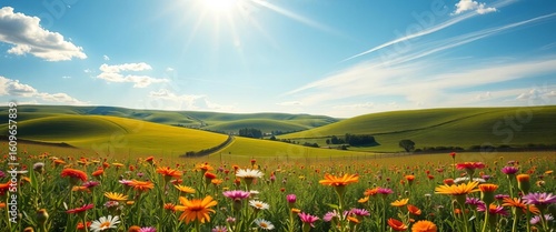Fototapeta premium Sun-drenched field of wildflowers, rolling green hills under a vibrant blue sky, growth, farmland