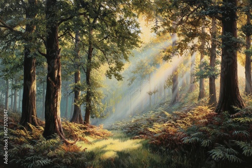 © binara, Obraz premium Sun-Drenched Forest Path - Ethereal Light Through Trees, Serene Nature Scene.