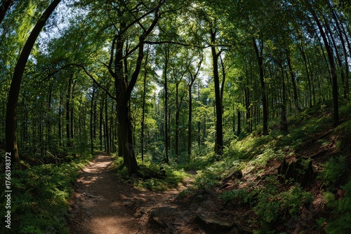 © Rayyan, Fototapeta premium Sun Drenched Forest Path Through Lush Green Trees and Foliage in Natural Setting Under Bright Sky