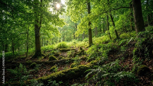 © Stonks, Fototapeta premium Sun drenched forest with ferns and moss