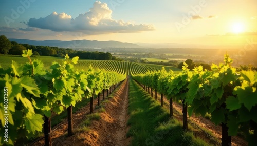 Naklejka premium Sun-drenched Freiburg vineyards, rows of vines extending to horizon , wine region, vineyard scenery
