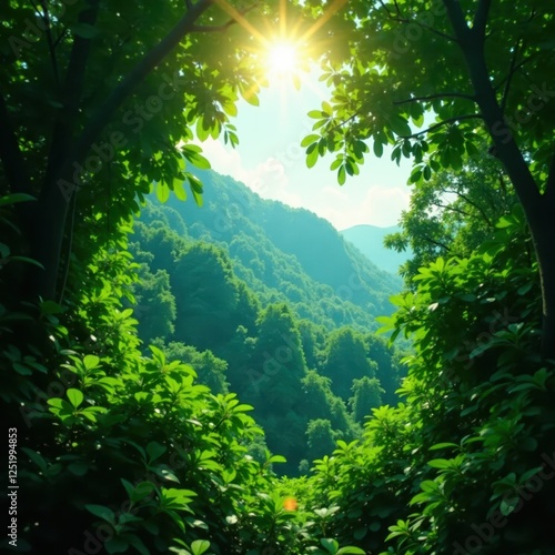 Obraz premium Sun-drenched Guadeloupe rainforest canopy, vibrant green foliage, sunlight, sun, vibrant