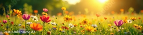© Pat, Fototapeta premium Sun-drenched meadow, vibrant wildflowers in bouquet , stock, landscape