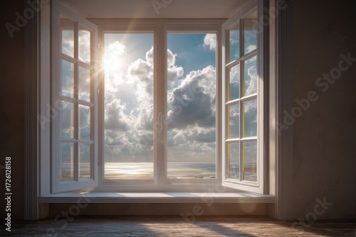 © Helpi, Obraz premium Sun-Drenched Open Window Revealing a Vast, Cloud-Filled Sky and Horizon.