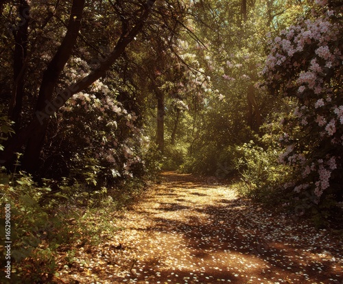 © Sans, Obraz premium Sun-Drenched Path Through a Lush Forest of Blooming Rhododendrons