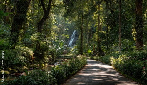 © orang, Fototapeta premium Sun-drenched path through lush tropical park with waterfall