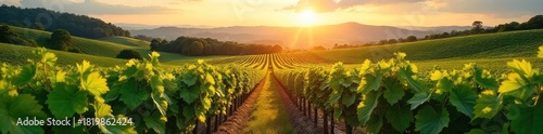 Naklejka premium Sun-drenched rows of grapevines stretching across a picturesque vineyard, ready for harvest Lush foliage and rolling hills create a stunning landscape , wine grapes, rows of vines