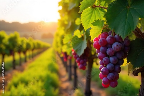 © Nannapin, Fototapeta premium Sun-drenched rows of ripe grapes hanging heavy on the vine in a picturesque vineyard, ready for harvest Golden sunlight bathes the landscape , eco-friendly, sun, vineyard landscape