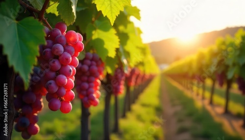 Fototapeta premium Sun-drenched rows of ripening grapes hanging heavy on the vine, ready for...