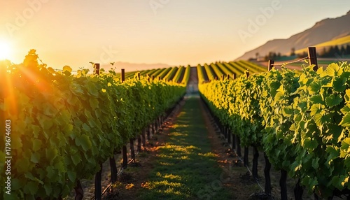 Naklejka premium Sun-drenched rows of vines on a South African vineyard, Western Cape, scenic,...