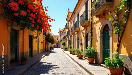 Fototapeta premium Sun-drenched Seville streets, vibrant orange blossoms, intricate tilework on historic buildings A classic Andalusian scene, capturing the essence of southern Spain's beauty , orange, alleyway, facade