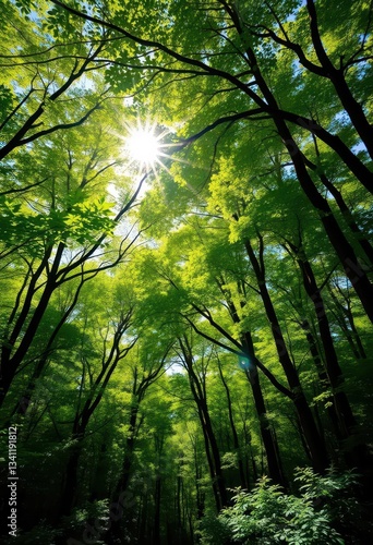 Naklejka premium Sun-drenched summer forest panorama, vibrant green canopy, dappled light, photography, landscape, background
