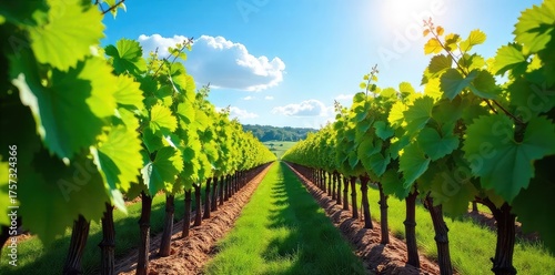 Fototapeta premium Sun-Drenched Vineyard Landscape Lush Grapevines Stretching to the Horizon Under a Bright Blue Sky, Ideal for Wine Country Tourism and Label Design