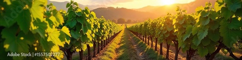 © Wannisa, Naklejka premium Sun-Drenched Vineyard Ripe Grapes Ready for Harvest on Lush Hillside Vines