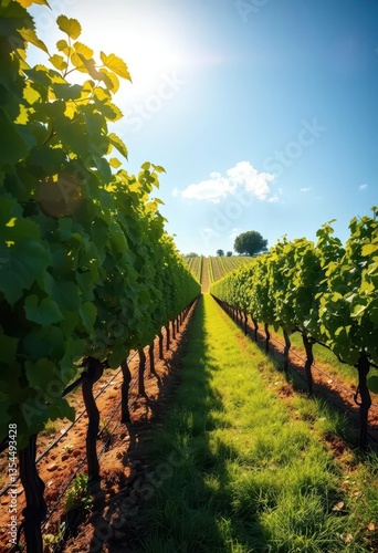 Fototapeta premium Sun-drenched vineyard rows, lush green vines under a bright sky, beautiful,...
