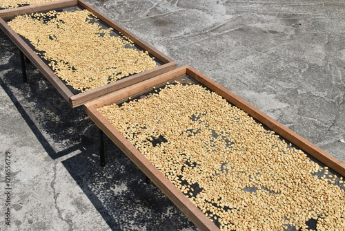 Naklejka premium "Sun-dried coffee beans inside the rack"