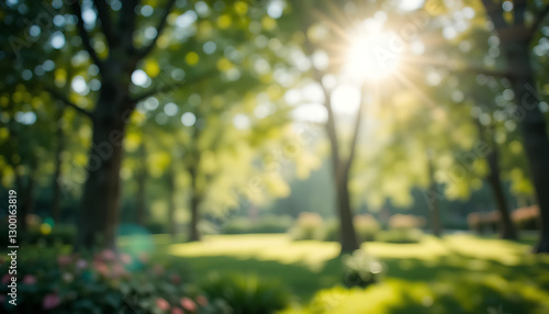 © Waseem, Fototapeta premium Sun-Filled Garden Scene with Blurred Trees and Lush Green Grass on a Warm Day