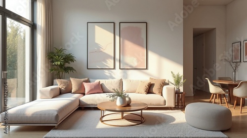 Fototapeta premium Sun-filled modern living room with neutral tones, tranquil ambiance