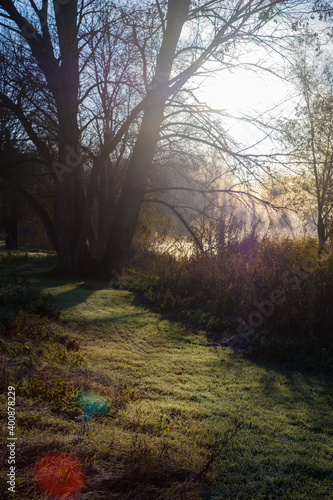 Fototapeta premium Sun flare shining between winter tree branches tree on a frozen green grass...