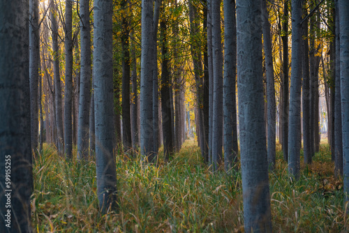 © Cavan, Fototapeta premium sun illuminating over poplar forest in autumn