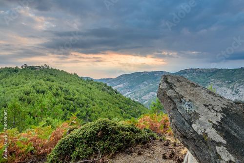 Naklejka premium Sun is setting behind dramatic clouds over Thassos Island, Greece - spectacular landscape, shot from a high view point