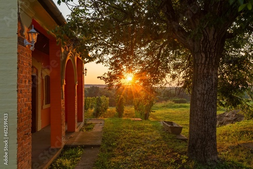 © Patric Deflorian/Wirestock Creators, Obraz premium Sun is setting behind the trees in the yard of a house