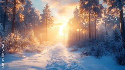 © RaiGhulam, Naklejka premium Sun is setting behind trees in snow