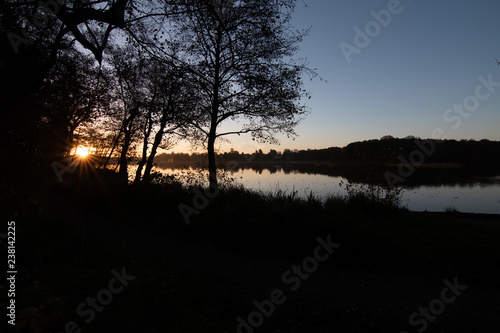 Fototapeta premium Sun just about to rise over lake - orange; trees to the left