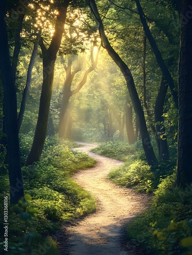 Obraz premium Sun-Kissed Path: A winding trail through a serene and enchanting forest,...