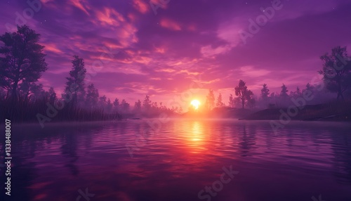 Fototapeta premium Sun-kissed spring water reflecting vivid purple skies in early dawn