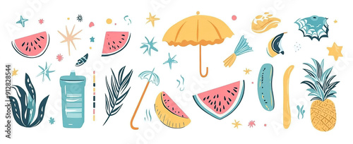 Fototapeta premium Sun-Kissed Style: Hand-Drawn Abstract Summer Elements and Vacation Motifs,...