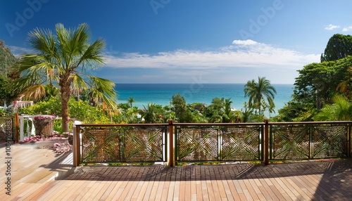 Obraz premium Sun-Kissed Tranquility: Stunning Garden and Sea View from the Hotel Balcony