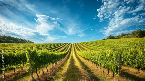 Fototapeta premium Sun-Kissed Vineyards: A Breathtaking View of Grapevines Under a Blue Sky