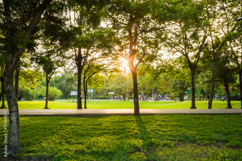 © themorningglory, Fototapeta premium Sun light beam on park with tree green grass