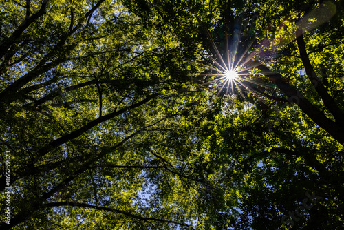Obraz premium Sun light breaking though a canopy of tree leaves