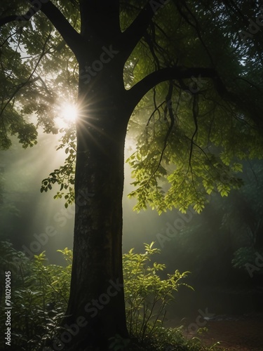 Obraz premium sun light passing through green-leafed tree in a rainy day misty morning in...
