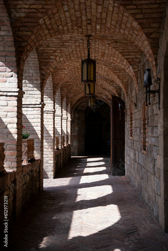 © Martin, Fototapeta premium Sun light shinning through arched brick windows in a long castle corridor.